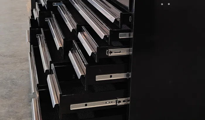 Tylių skaidrių bėgiai: Juodojoje daugiafunkcinėje įrankių spintelėje yra sunkiųjų tyliųjų skaidrių bėgių, sklandžiai traukiantys veiksmą ir stiprią apkrovos guolio galią.
