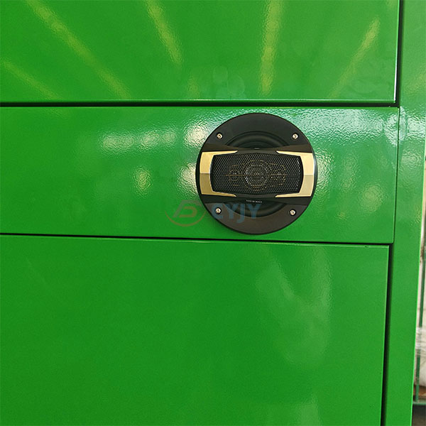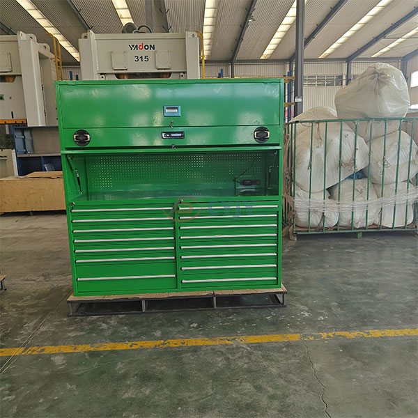 Daugiafunkcinė garažo įrankių spintelė yra pagaminta iš aukštos kokybės šaltai valcuoto plieno ir yra žalios spalvos, todėl bet kuri darbo vieta suteikia spalvingumo. Spintelė turi kelis stalčius su priedais, tokiais kaip šviestuvai, garsiakalbiai ir kištukų juostelės.